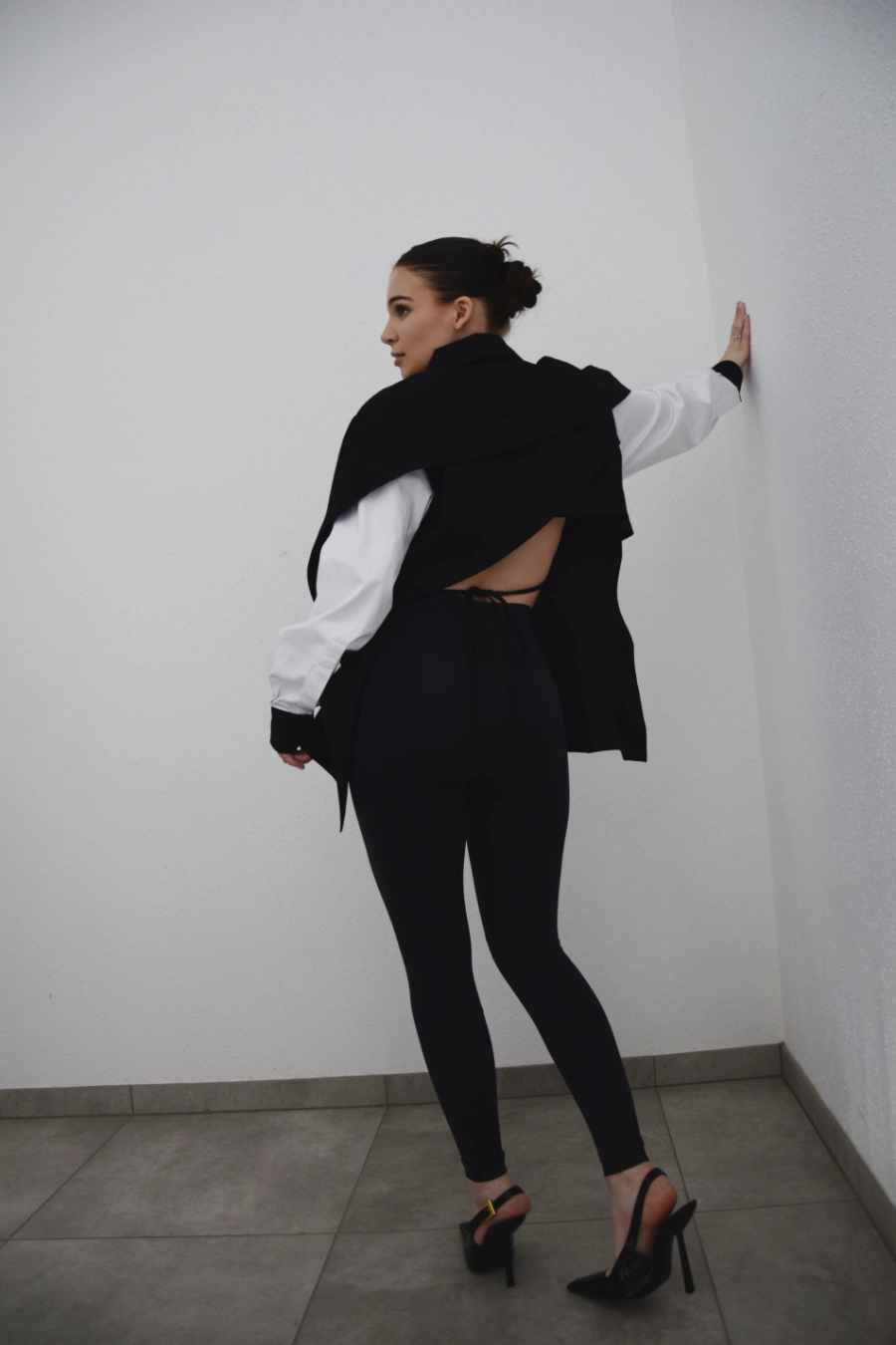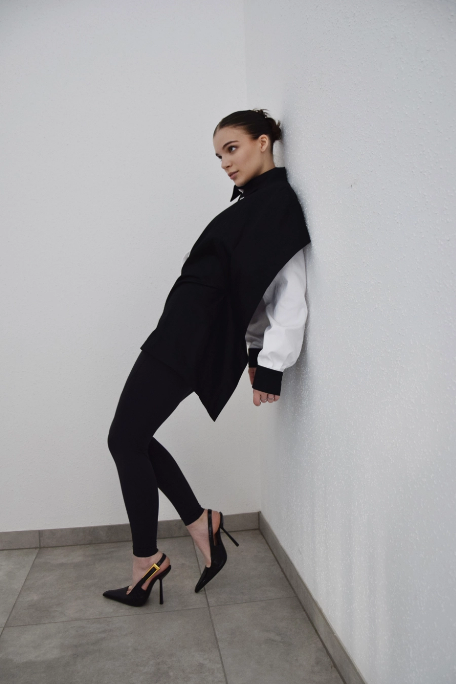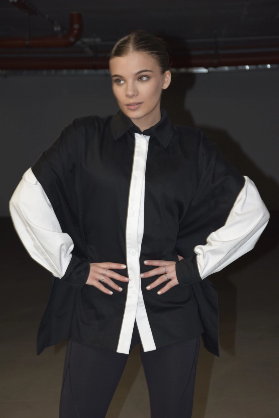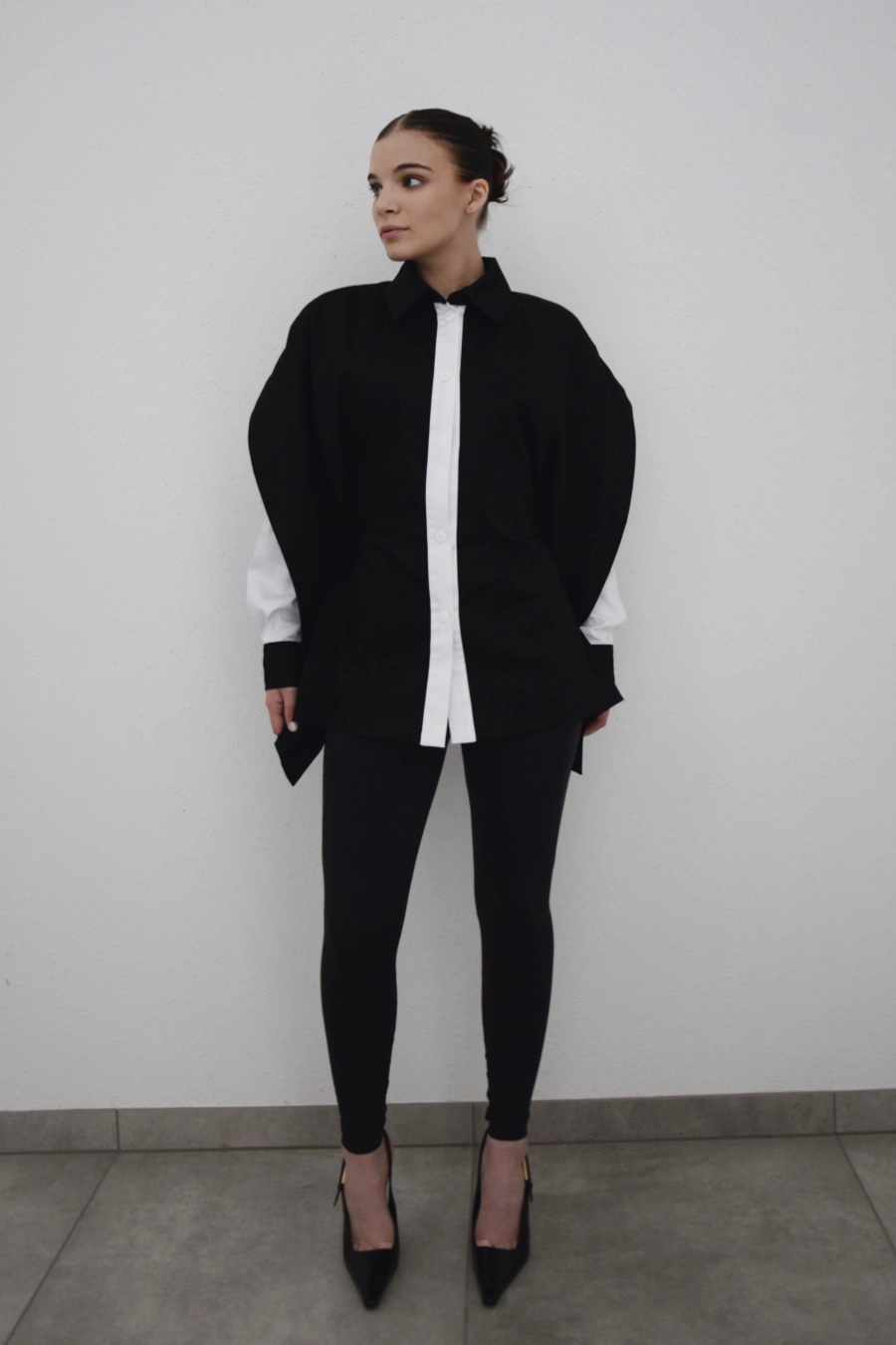 Nowoczesna koszula o wyrazistym, czarno-białym kontraście i oversize’owym kroju. Z przodu minimalistyczna i elegancka, z tyłu zaskakuje subtelnym odkryciem pleców oraz wiązaniem, które pozwala dopasować ją do sylwetki. Dzięki temu możesz nosić ją luźno – w bardziej swobodnej, modowej formie – albo delikatnie wytaliować, podkreślając figurę. To koszula, która łączy klasykę z nowoczesnym designem i daje wiele możliwości stylizacji.
