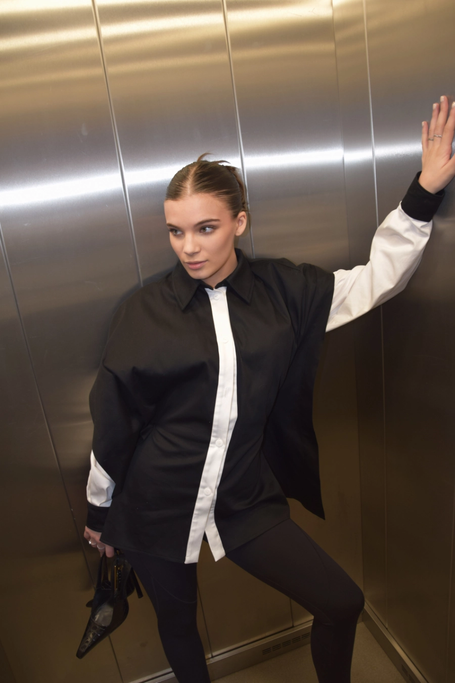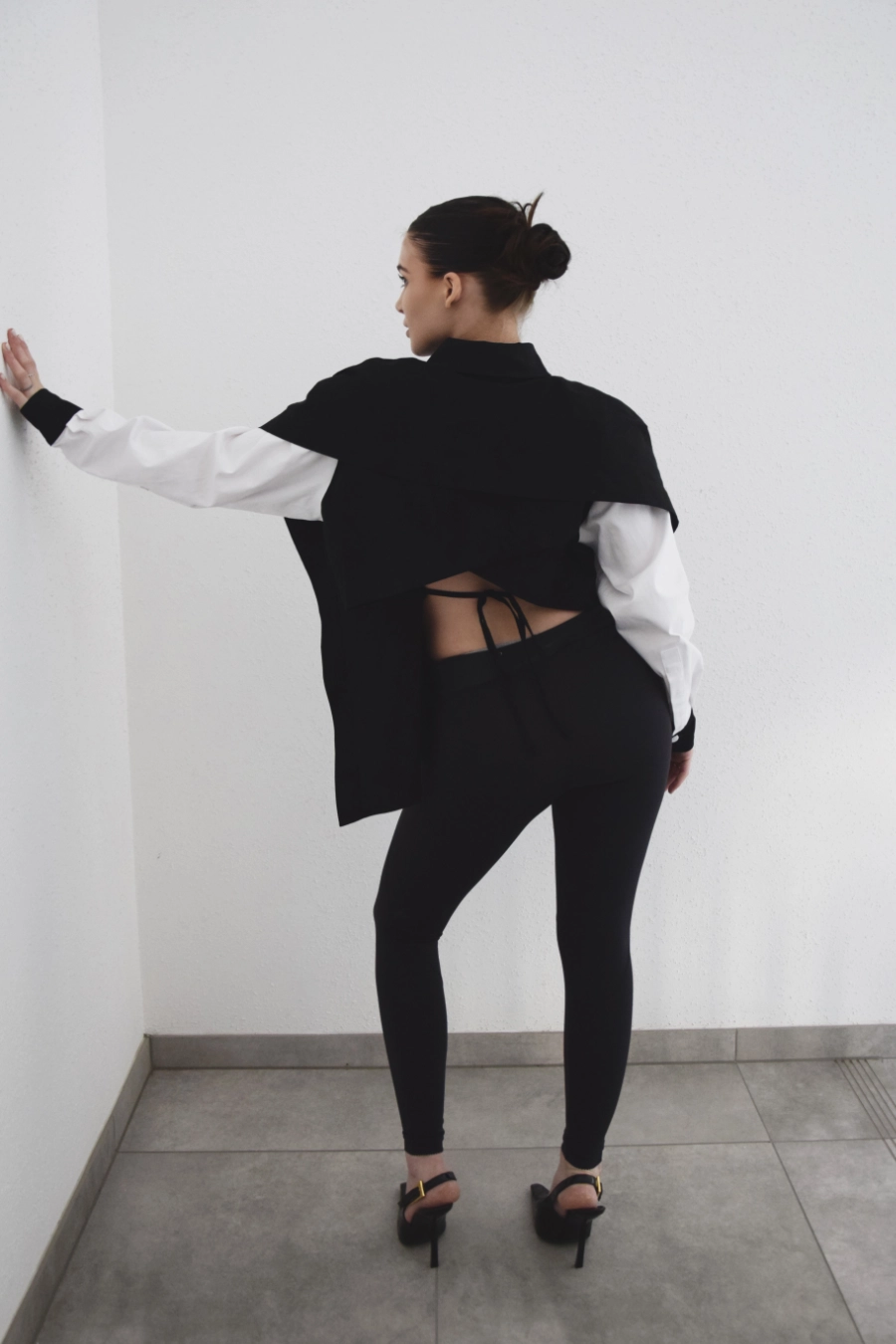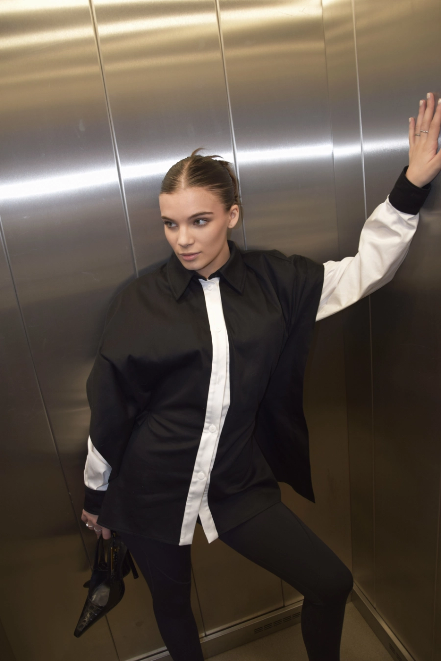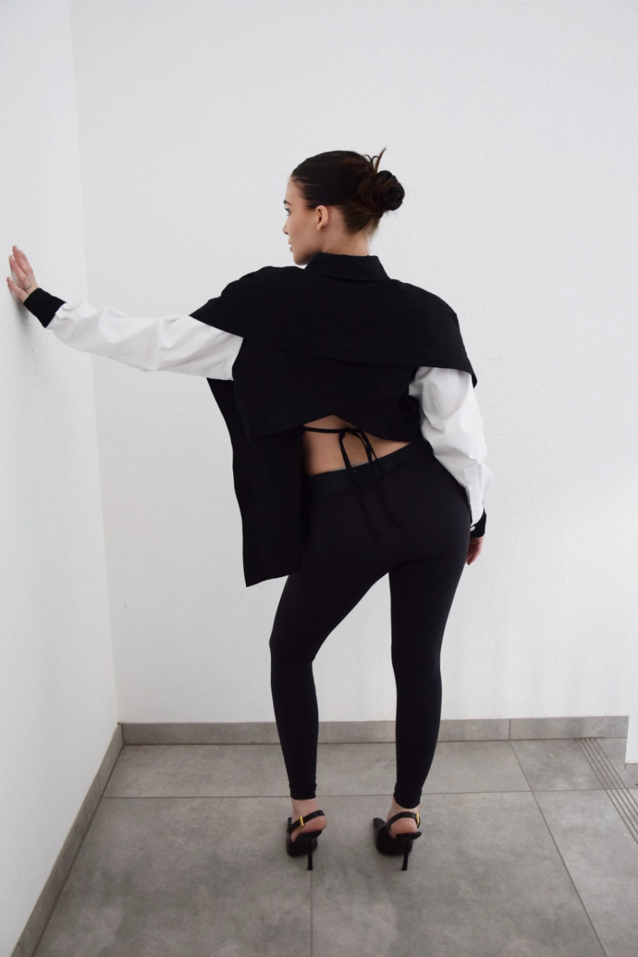 Nowoczesna koszula o wyrazistym, czarno-białym kontraście i oversize’owym kroju. Z przodu minimalistyczna i elegancka, z tyłu zaskakuje subtelnym odkryciem pleców oraz wiązaniem, które pozwala dopasować ją do sylwetki. Dzięki temu możesz nosić ją luźno – w bardziej swobodnej, modowej formie – albo delikatnie wytaliować, podkreślając figurę. To koszula, która łączy klasykę z nowoczesnym designem i daje wiele możliwości stylizacji.