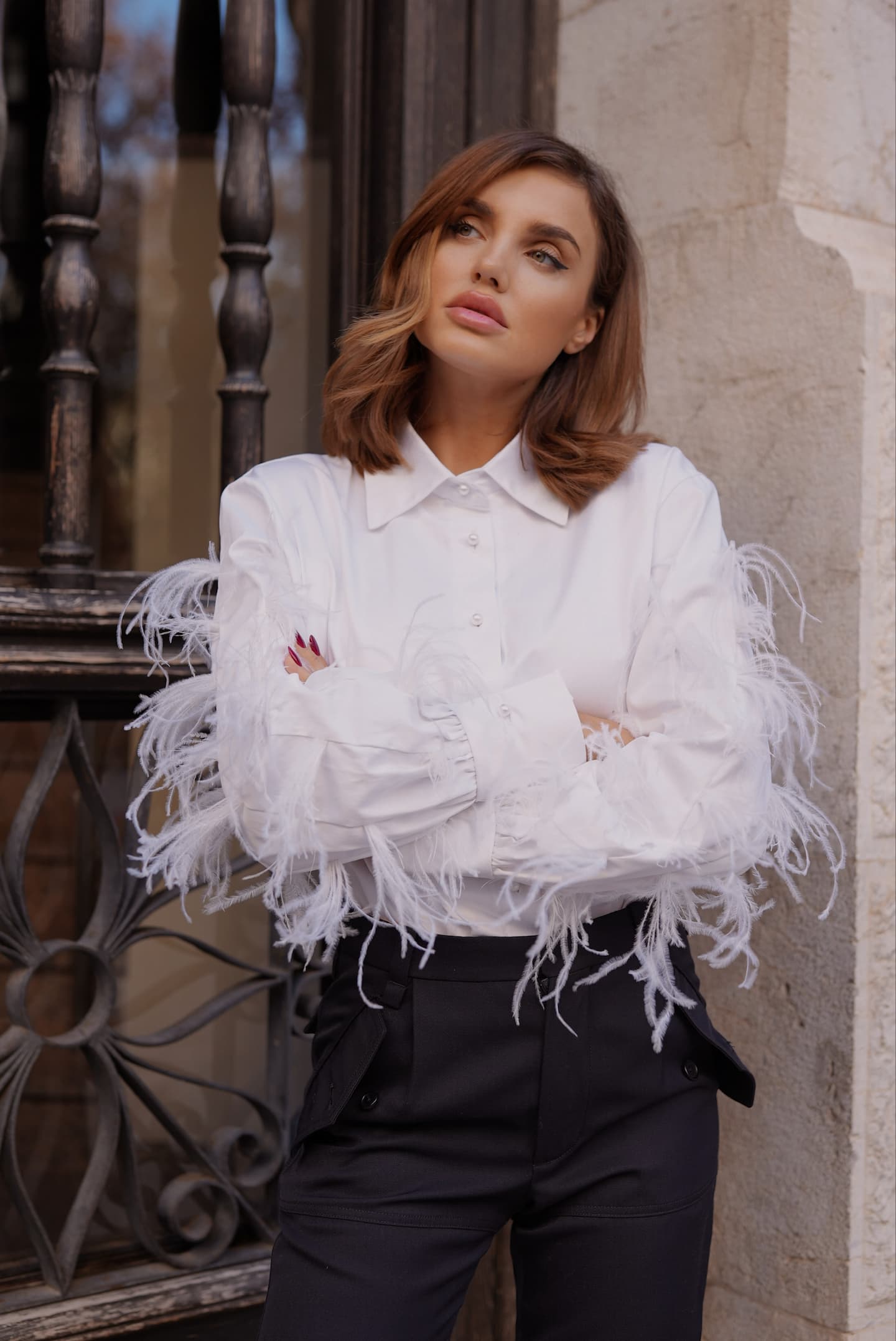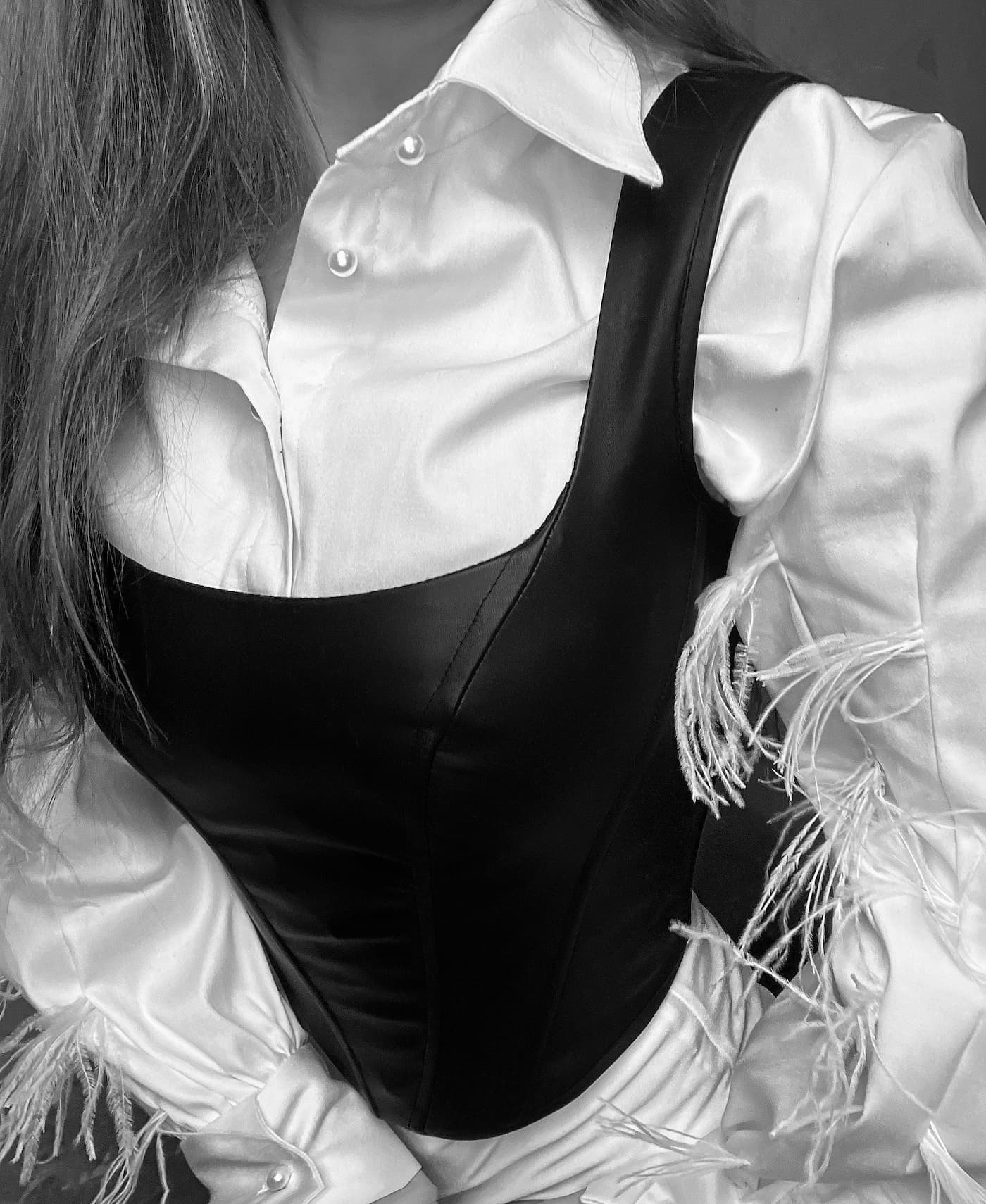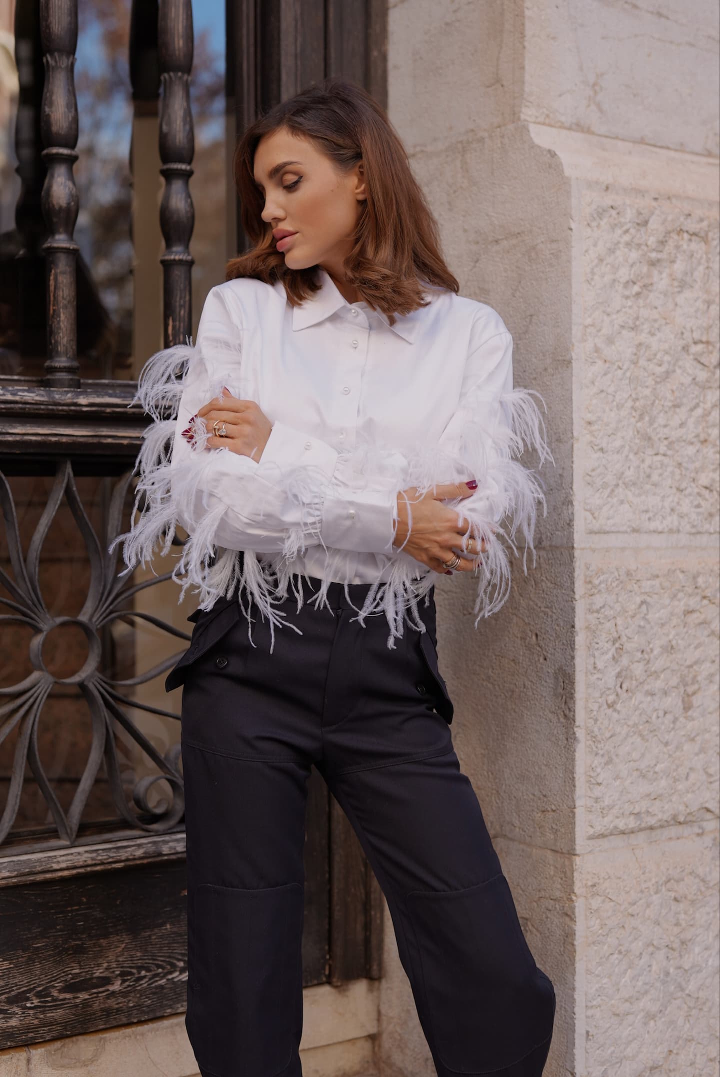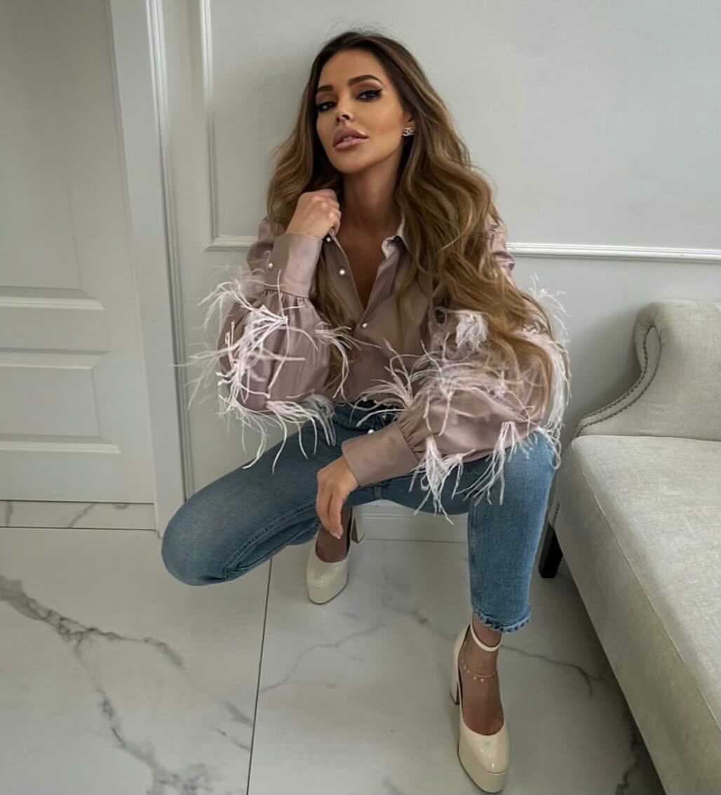 Koszula bawełniana w formie body z dodatkiem strusich piór na rękawach , ozdobiona guzikami perełkami