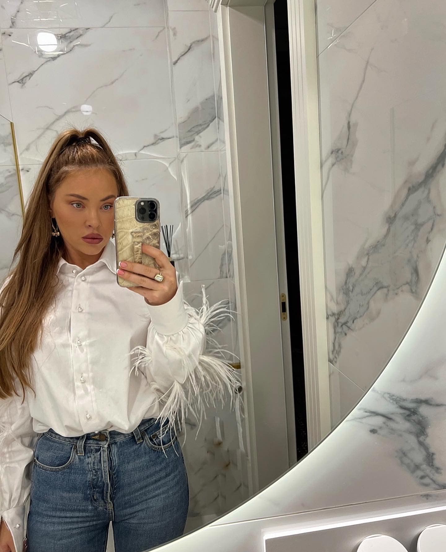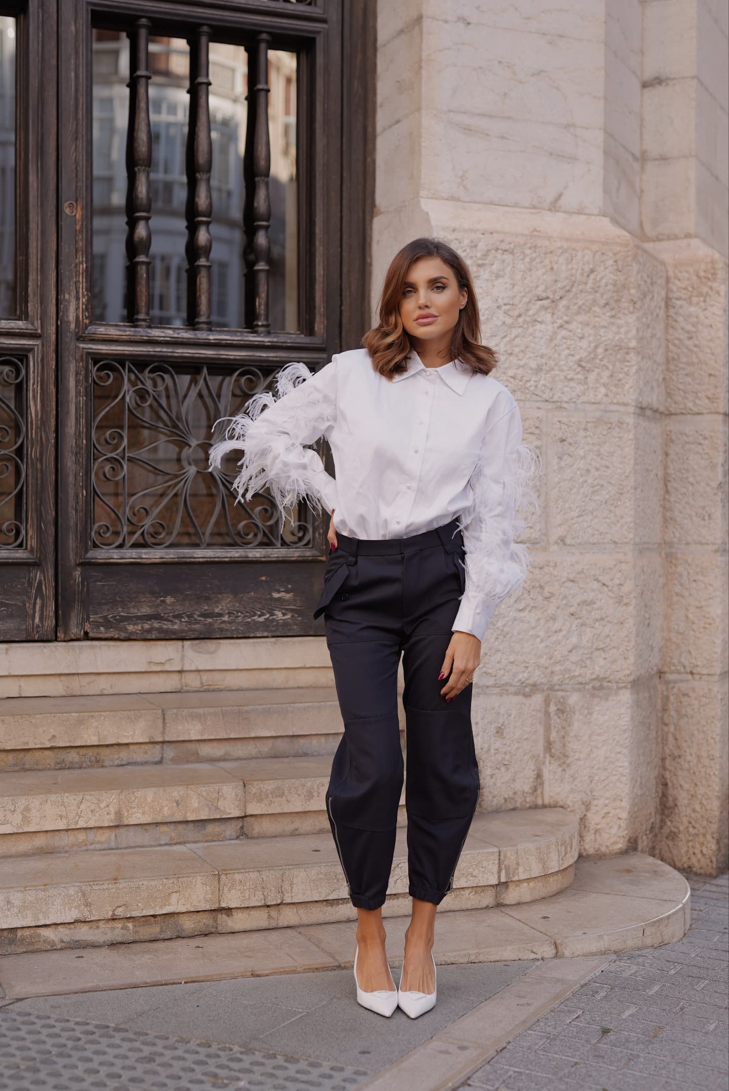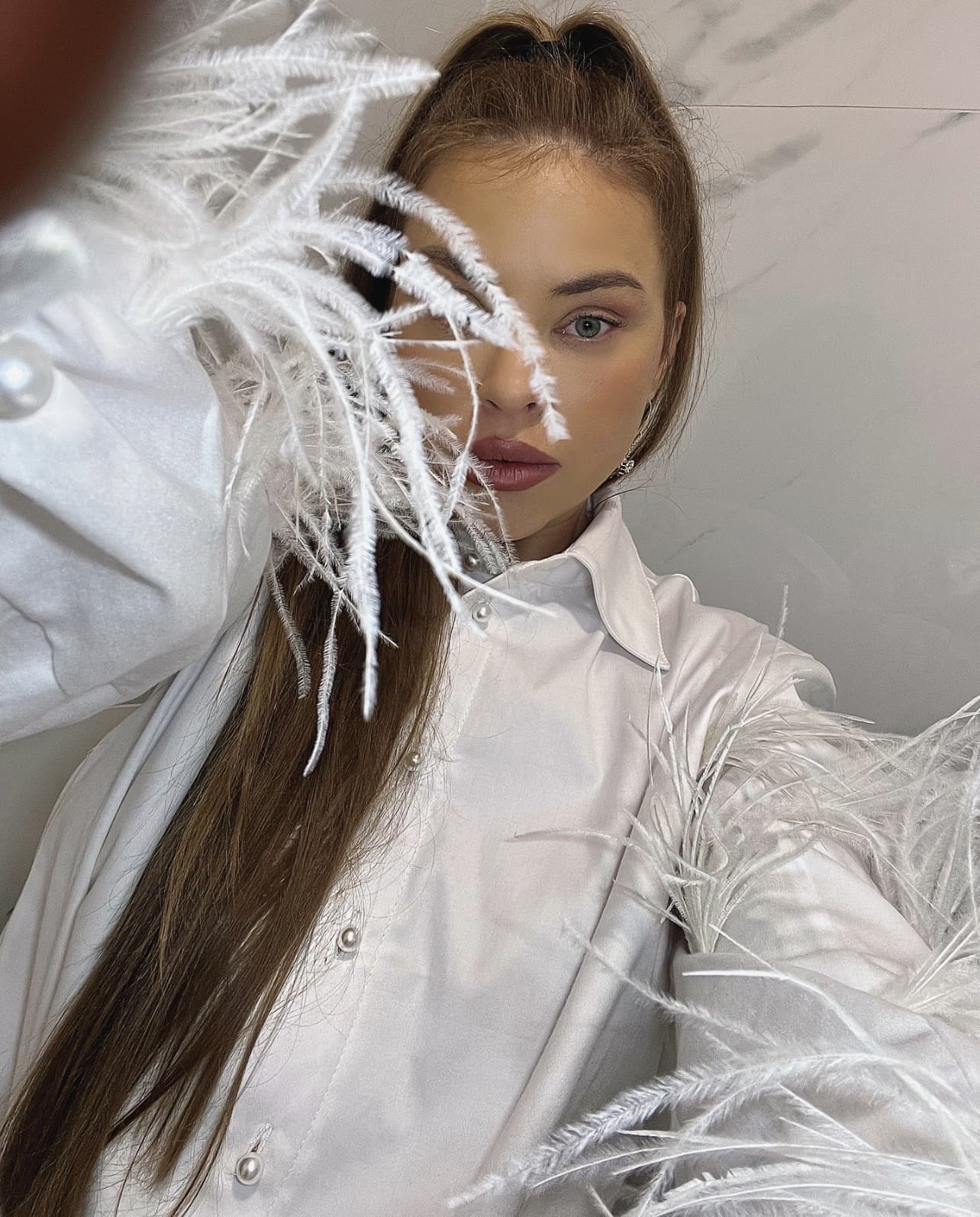 Koszula bawełniana w formie body z dodatkiem strusich piór na rękawach , ozdobiona guzikami perełkami